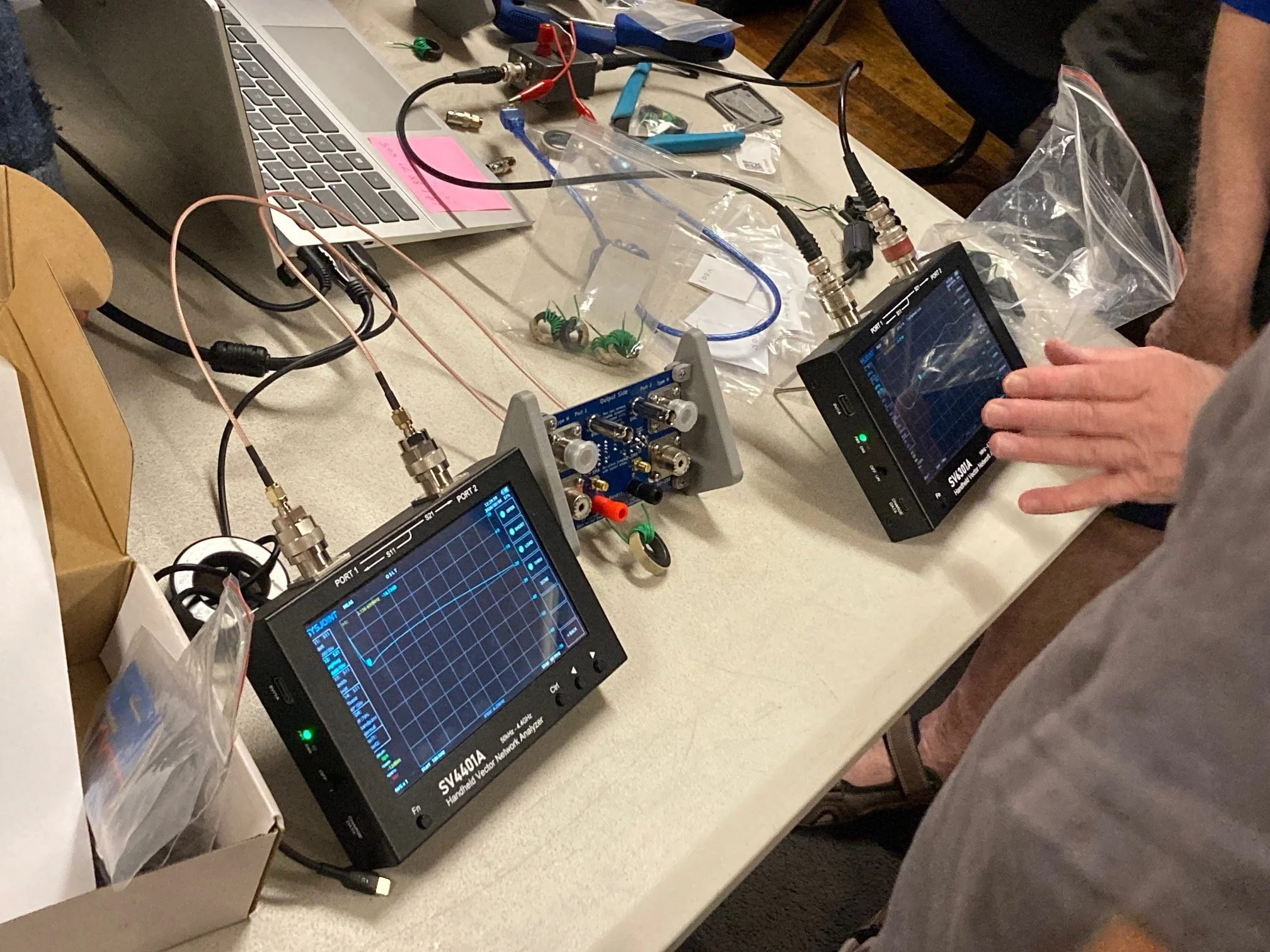 This is where Andre’ VK7ZAB, made a big impression, he had pre-installed the “nanoVNA Saver” software on a laptop specifically for the remote control of these VNAs via USB. This allowed access to all menu items that are normally available on the VNA and displayed all numerical and graphical results. The laptop intern was connected to the large screen wall monitor in the main club room. This allowed for easy visibility of the VNA’s display and its generated smith charts and attenuation graphs. Settings and changes made on the field device were also mimicked back onto the laptop and vice versa. The demonstrations took place with a pair of SYSJOINT, Handheld VNAs, one a SV4401A and the other a SV6301A, usable to 4.4 GHz and 6.3 GHz respectively.