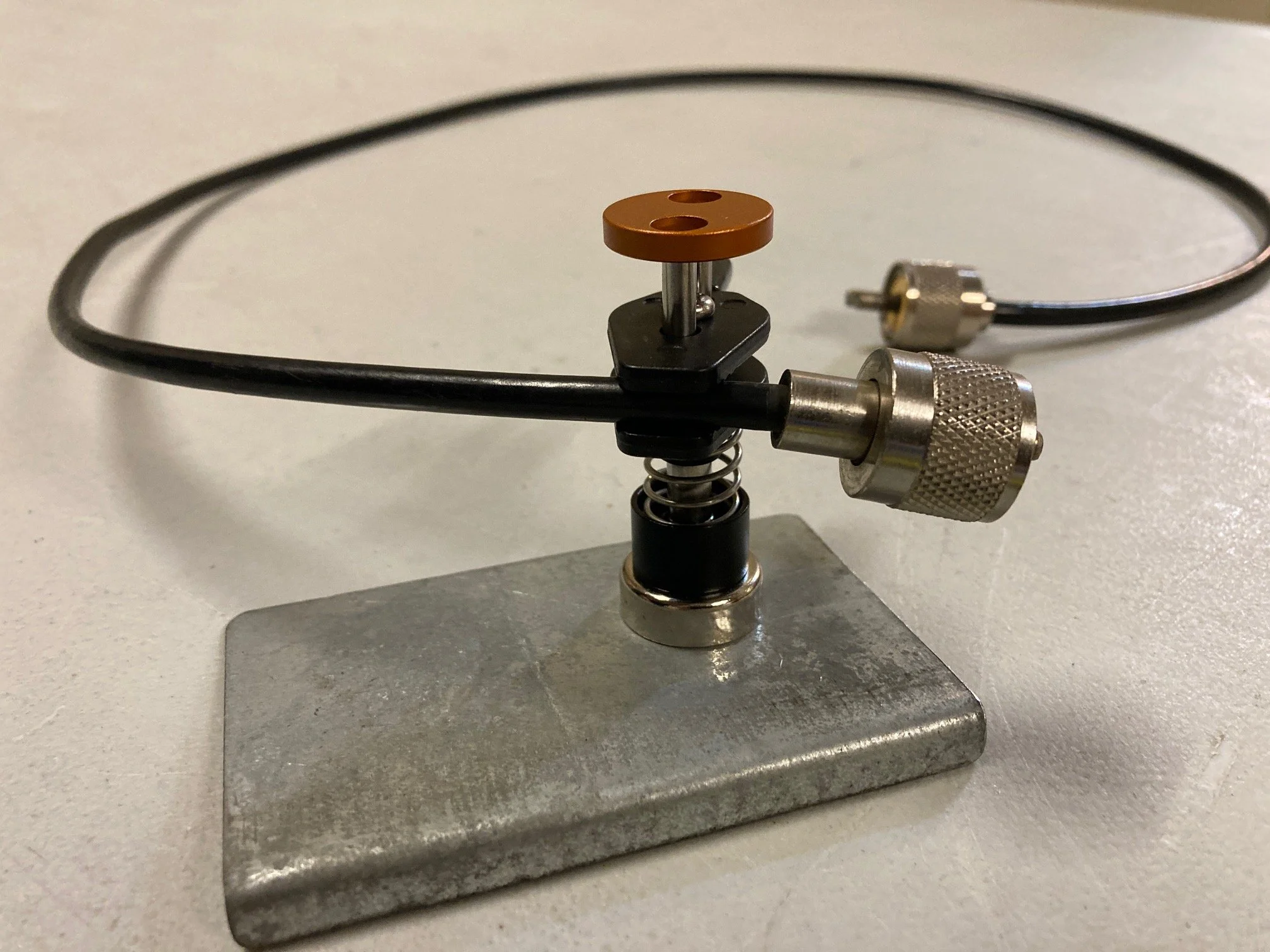 Last Technical Night Colin VK7ZCF, brought in a pair of aluminium “extra hands”, not the alligator clip jaw type, these ones are individual and have single spring clamp jaws, mounted on a 50 mm pole with a very strong magnetic base. Ideal for holding small objects or wires together while soldering or even gluing items. They are very versatile as your work area is only limited by the size of the magnetic sheet you provide for them to attach to. Surprisingly well engineered considering the price and online shop of origin. HiHi