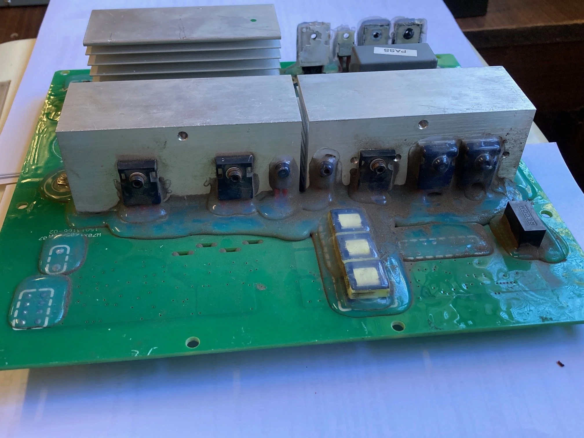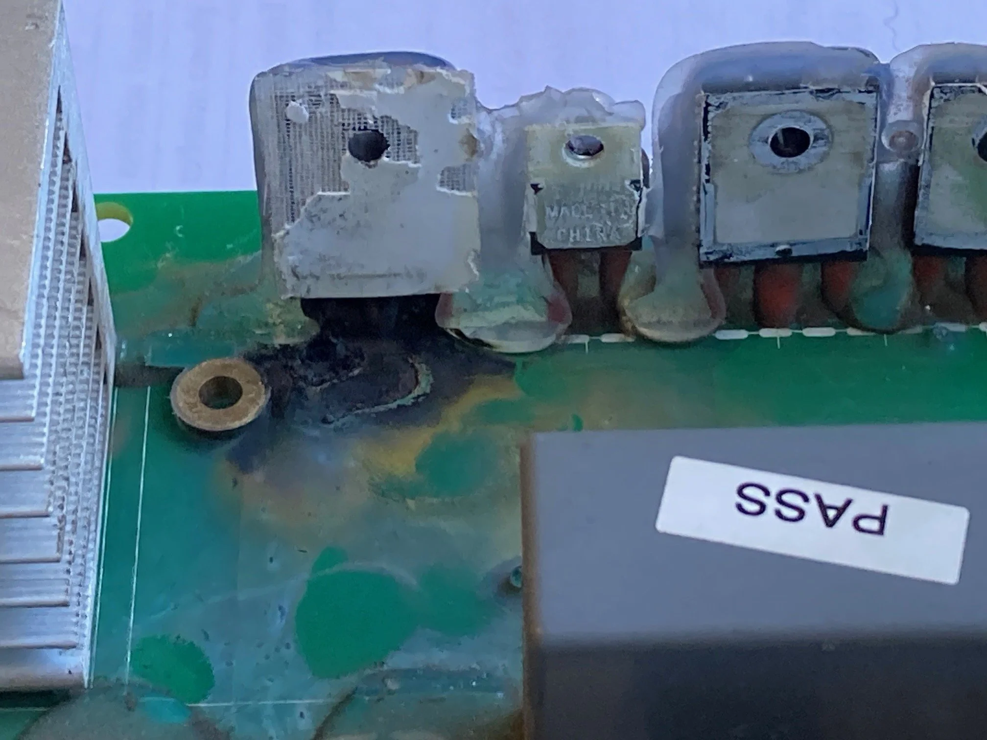 Imagine a substantial PCB about 300 mm in size. A bank of high power MOSFETS and a hefty finned aluminium heatsink. The MOSFETs are mounted vertically on the printed circuit board and bolted to the side of the heatsink. The heatsink is mounted on plate through 3 mm stand offs. All the board components including these devices were coated with that funny white Silicone / Acrylic conformal coating that protects them. So maybe the one MOSFET that had disgorged its inner contents into the atmosphere had suffered from a catastrophic overload, as its leads were still clearly covered with the protective coating?
