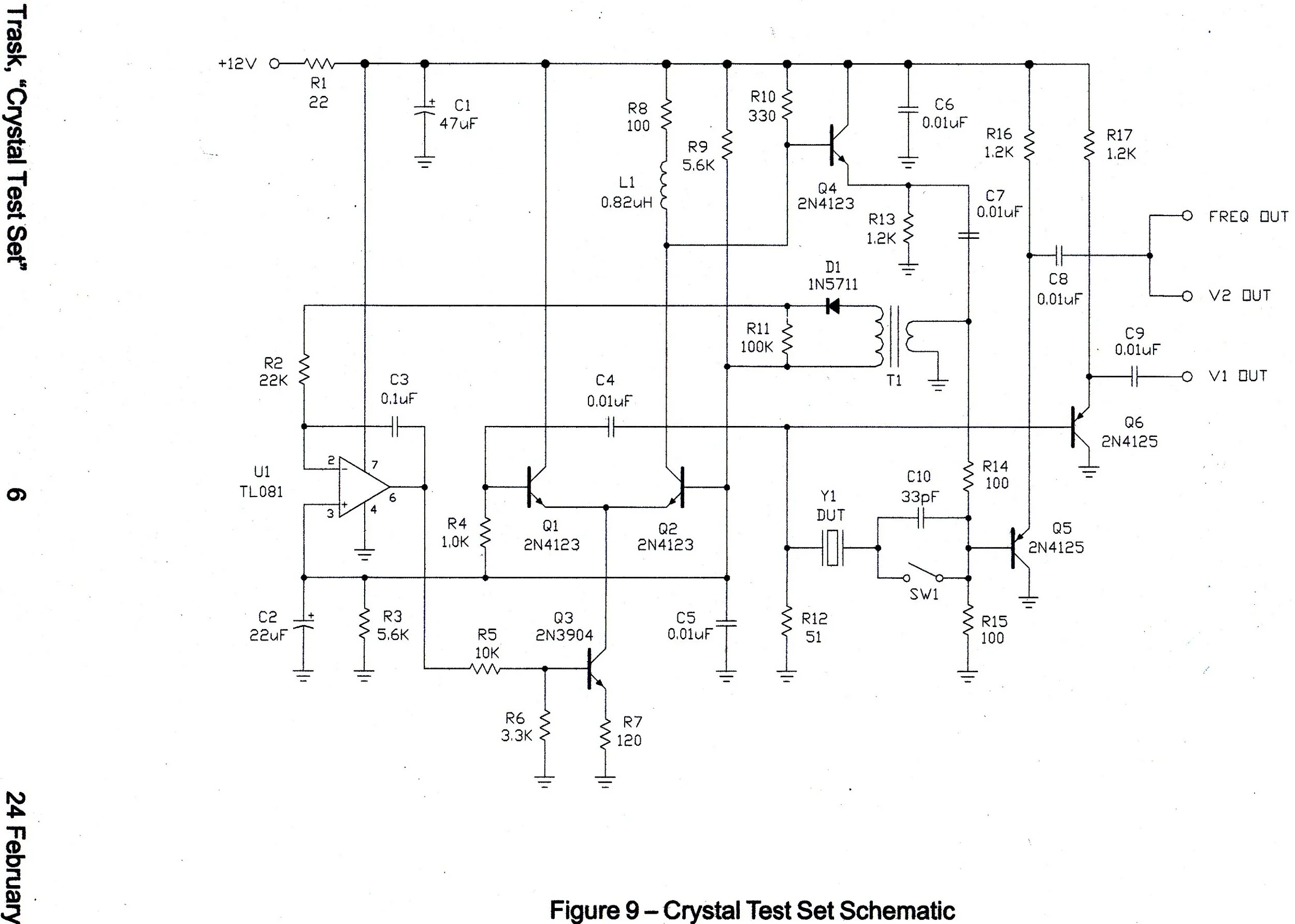 The design is based on a paper published by Chris Trask, N7ZWY from Sonoran Radio Research in Tempe, Arizona, USA. Titled “A Practical Test Set for Comprehensive Crystal Testing”, published in 2008. This is considered to be one of the definitive papers on the measurement of series resonant parameters of a crystal. The circuit is based on a differential Butler oscillator which in this case allows for parameter testing and measurement in a linear, non-saturated mode. External measurement ports for his Vector Voltmeter and Oscilloscope are also buffered from the crystal under test. The beauty of this particular design is the very high level of accuracy and repeatability of measurements. This confidence in results is paramount for the selection of crystals, to a very close tolerance, for the implementation of a ten pole ladder filter Trevor is designing.