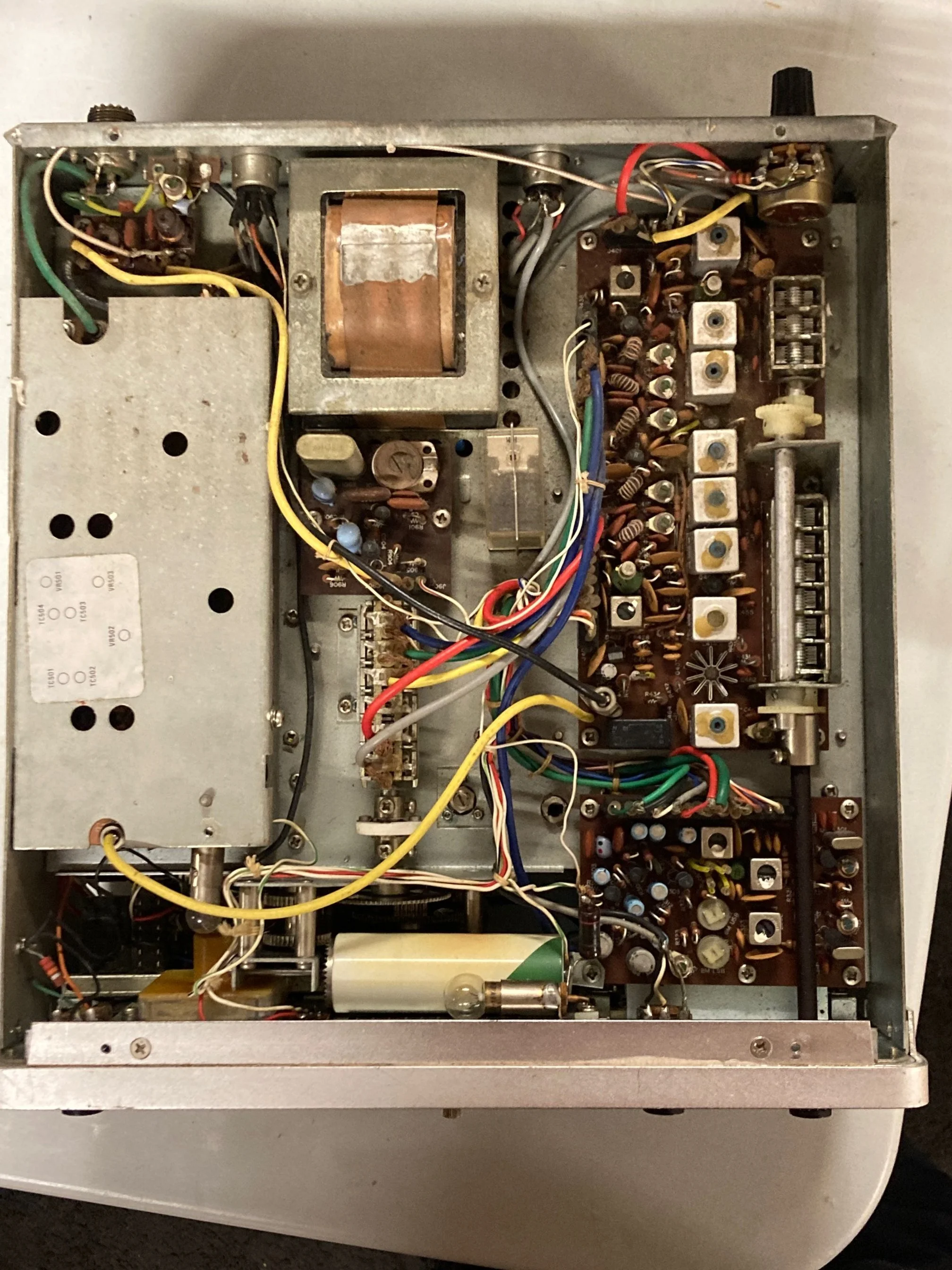 This 6 Metre band rig covers from 50 to 54 MHz divided into eight 500 kHz selectable band portions. Check out the picture for the rotating dual coloured white and green disk behind the frequency window to denote the 100s of kilohertz portion of the frequency. Its output may only be 4 Watt AM with 10 Watt SSB and CW but it is certainly sporting classic 70s rectangular push buttons on the front panel. Nice little rig Ross, good luck returning it to full service.