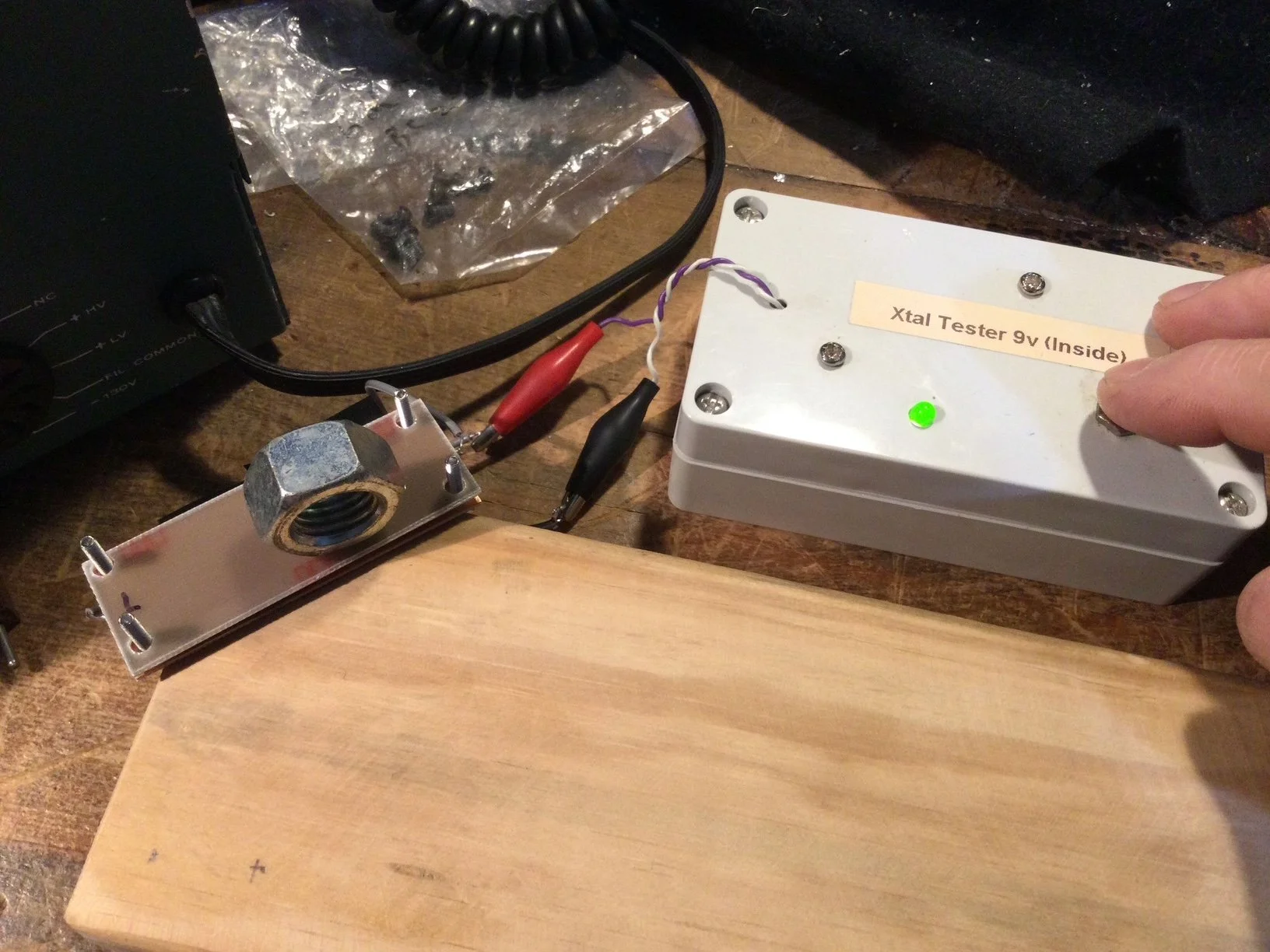 He used a glass plate from an old set of bathroom scales for the very flat sanding surface. A sheet of 600 grade wet & dry was held on the glass with electrical tape. He constructed a jig to test the crystal without having to put it back in the crystal holder after each sanding session. Used 99% isopropyl alcohol to clean the crystal each time it’s tested - wiping it with a ‘magic’ synthetic duster.